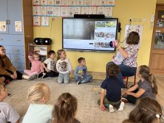 Ten tydzień przyniósł przedszkolakom też dwie niespodzianki -przygodę w kinie sferycznym gdzie doświadczyły niezapomnianych doznań podczas bajki o kreciku w kosmosie. Wzięły udział w przedstawieniu teatralnym o zwierzątkach gdzie nauczyły się ,że nie mówimy nic złego o innych, aby potem nas nic podobnego nie spotkało.