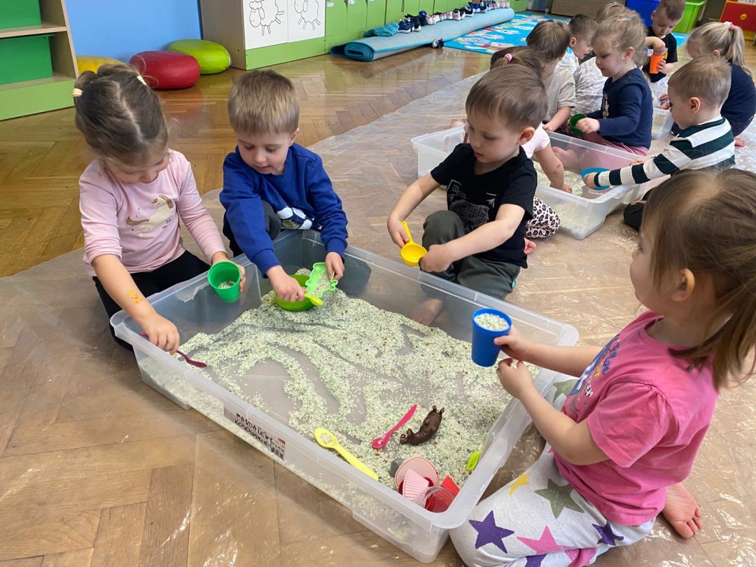 Ten tydzień zaczął się wycieczką po najbliższej okolicy przedszkola. Przeszliśmy główną ulicą najpierw po przejściu dla pieszych zachowując wszystkie zasady bezpiecznego poruszania się po drodze, przeszliśmy przez osiedle poznając swoje ulice, dom, świat. Na osiedlu pozbieraliśmy kasztany do kącika przyrody i po przejściu na światłach wróciliśmy do przedszkola. W tym tygodniu dużo się działo i dużo nowych rzeczy poznaliśmy. Podczas całego tygodnia przekonaliśmy się że piękny jest otaczający nas świat. Odbyliśmy podróż do prehistorii odwiedzając nasze ulubione dinozaury, ucząc się ich skomplikowanych nazw ,przeliczając ich rodziny. Podczas zabawy w paleontologów odkrywaliśmy szczątki dinozaurów, a podczas zajęć plastycznych układaliśmy z patyczków do uszu szkielet dinozaura. Po południu bawiliśmy się figurkami dinozaurów tworząc Park Jurajski. Poznaliśmy też historię naszej ziemi oraz odbyliśmy podróż w jej podziemia poznając historię kopalni soli w Wieliczce.