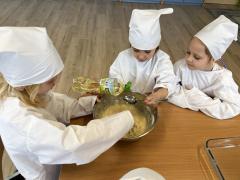 Wspólnie przygotowały – jabłko pieczone z miodem i cynamonem, co zachęciło je do częstszego  jedzenia owoców w formie deserów i przekąsek. Nauczyły się nazw poszczególnych owoców i warzyw , a także ich cech jak kształt ,kolor , wielkość.